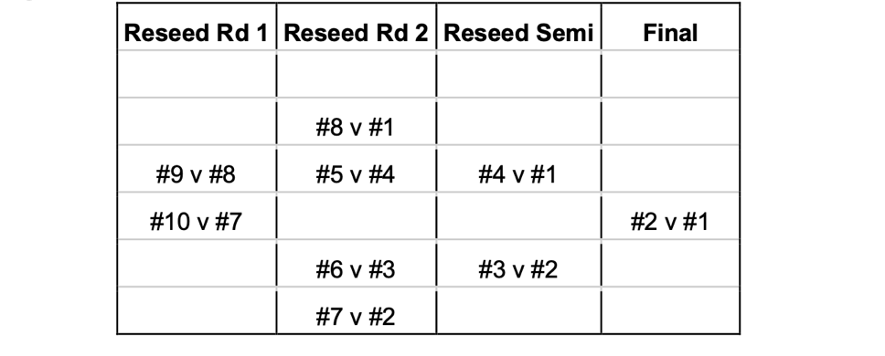 RESEED after each Round with highest seed as Home Team (tie breaks will be determined each round based on regular