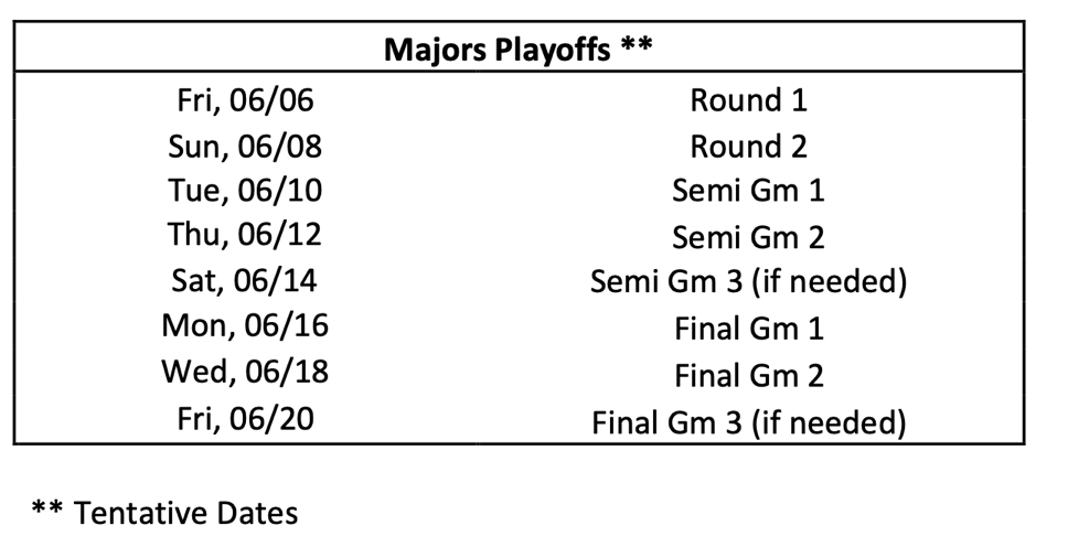 Rainout Policy: Rainouts will be played the next night, in all playoff rounds, and the following games do not get moved.